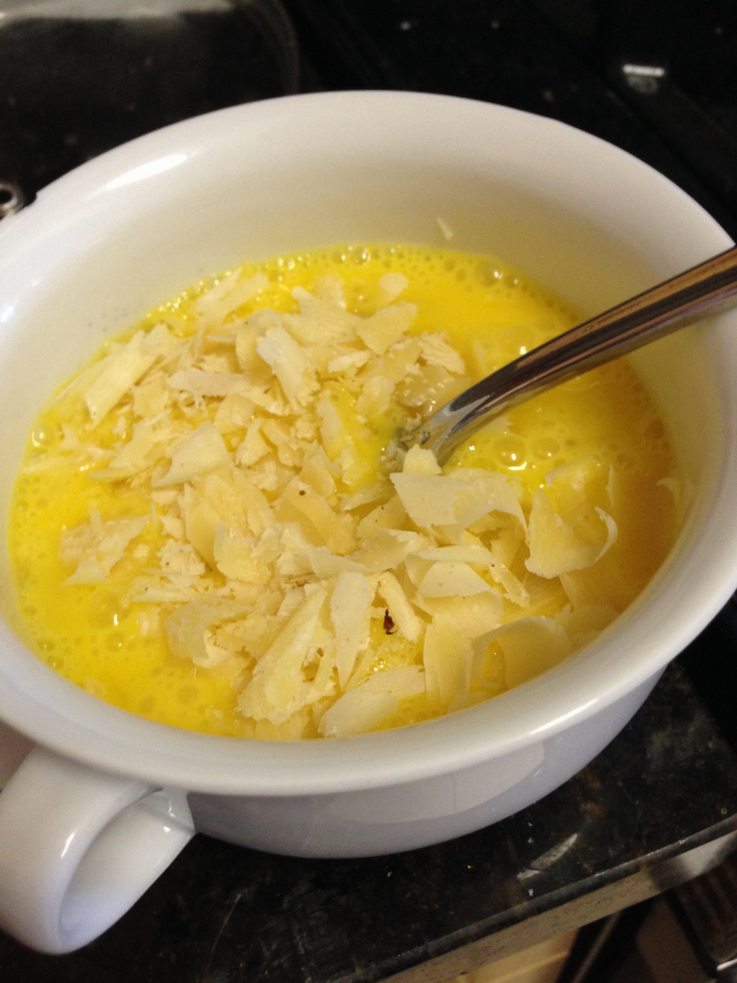 6. Scramble the eggs! Add the shredded cheese and go ahead and add 8 cranks of the pepper mill.