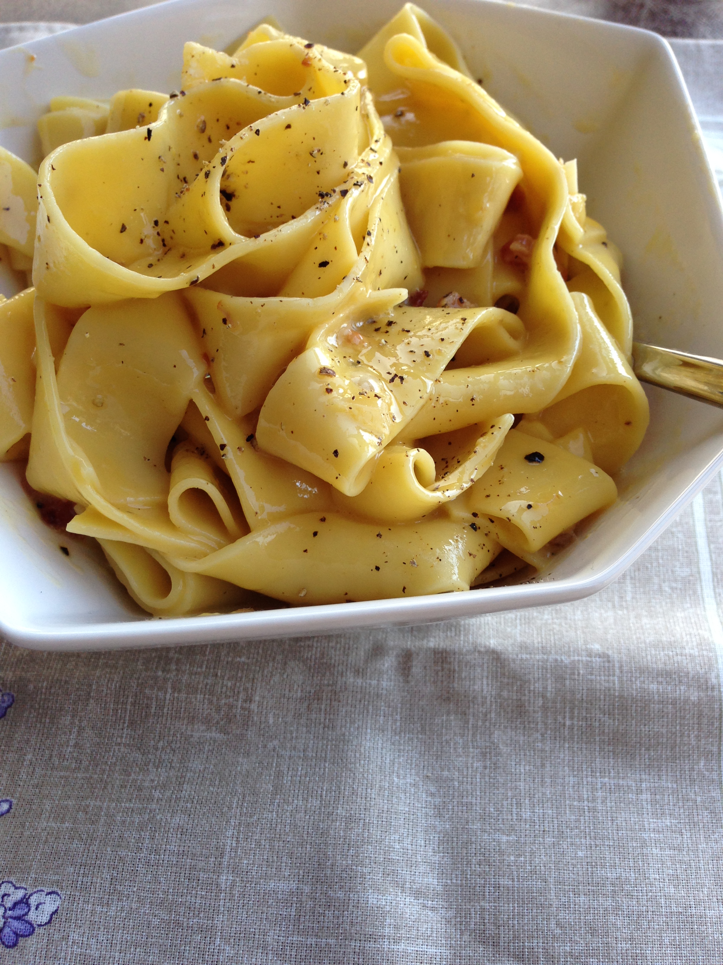 Memories of that meal led me to recreate the dish at home many times. It is an impressive dish to whip up with ingredients you typically have in your pantry and fridge. And despite what others may say, I think this dish is relatively healthy. Eggs are a fabulous complete source of protein and contain a bounty of vitamins and other nutrients. I like to make this dish heavy on the eggs and black pepper and lighter on the cheese and bacon to keep it within reason. If you used whole wheat pasta this would clearly be healthier, but I just can’t bring myself to do that. Trader Joe’s pappardelle is the closest dried pasta can come to the real thing I had in Rome, and I’m not giving up that part of the decadence!